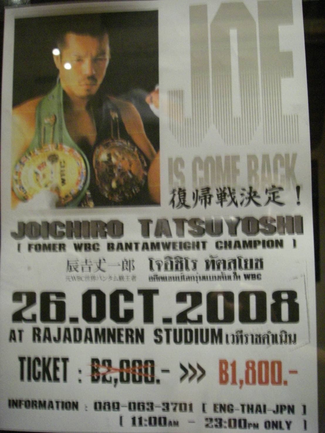 サワディーカップ タイ支部のオダサイです。 ボクシングに興味を持ち始めたのは、辰吉丈一郎がきっかけだった。 1991年のアブラハムトーレス戦から、テレビで中継される試合を見始めた。何度も何度も画面の中での戦いを見ていた、その辰吉丈一郎が、目の前のリングに登場した。 *** そこは、バンコクのラジャダムナンスタジアムで、2008年10月26日のまっ昼間だった。試合は、通常のムエタイ興行の中に組み込まれた。メインイベントではない、第二試合の辰吉丈一郎対パランチャイ・チュワタナ戦、通常のムエタイ興行と同じく、外国人用のチケット代は、1000バーツと2000バーツ。ムエタイの試合を目当てに来場したタイ人客は200バーツで観戦が可能だった。日本人がタイ人のふりをして入場しようとしても、特にこの日はチェックが厳しく、窓口から身分証明書(市民登録カード、またはパスポート)を出せと言われる。10倍の価格差とした料金設定に、全く納得はいかないが、会場まで来て引き返せない。 この試合の2週間前にポスターを見たのだった。 ”辰吉丈一郎復帰戦” "Joe will back " 世界中からの旅行者が集う一角である、カオサン通りの日本人向け旅行会社の軒先にそれは貼られていた。 いつの日にもカオサン通りに来ると非日常を味うことができた。1996年に初めてバンコクに立ち寄り、カオサン通りで宿を探した時の印象が強かった。湿気を帯びた熱風と、自由な雰囲気が旅人を引き寄せている。自身のことを述べると、2008年のその頃は、バンコクに拠点を移して1年目だった。チェンマイでのチャレンジは渡タイ早々に失敗し、バンコクで仕切り直しを決めた。その頃、とりあえずの仕事を探していたが、求職がうまくいかなかったり、息詰まりを感じると、このカオサン通りに赴き、気持ちをリセットしていた。 辰吉や日本のボクシングのニュースを、カオサンのネットカフェでチェックしてみた。屋台で買った甘ったるいタイのミルクティーを飲みながら、パソコンを眺める。 名城信男、内藤大助、新井田豊、そして辰吉に2回勝ったウィラポンと対戦した長谷川穂積、西岡利晃、と堂々たるチャンピオンのニュースが大きく扱われている。 辰吉丈一郎は、過去の存在となりつつあった。日本で試合を行うことが出来ないため、あらゆるルートを探り、またJBCの引退制限(37歳)を待ち、ようやく組んだ試合だろうことが分かった。若いころ、「一度でも負けたら引退する」と言っていた彼が、37歳を過ぎても、リングに執着している。タイのリングで、どのような姿を見せるのか、強く興味が沸いた。 その肝心の試合は、あっという間に終わった。2ラウンドでのノックアウト勝ち。対戦相手は実力不明のまま、倒れた。 勝つには勝ったが、そこから遡ること5年前に、テレビで見たセーン・ソー・プルンチット戦と比べても辰吉の動きはぎこちなく見えた。正直、もう少しリングの上の辰吉の実物を見ていたかった。 *** 2000年頃に、大阪府立体育館での興行の際、客席にジャージ姿で現れた実物を初めて見た。圧倒的なオーラを放っているように見えた、観客は客席の隙間を縫って歩く辰吉に注目し、リング上で試合していた選手たちよりも存在感を示していた。 ラジャダムナンスタジアムでは、リング上でも、期待していたその存在感は感じなかったが、ともあれ、再起戦を勝利した。 日本から駆け付けた、特攻服を来た応援団は勝利を祝い、ラジャダムナンの入口で万歳を繰り返していた。ムエタイ観戦が目当てのタイ人客は、第三試合、第四試合とプログラムが進むごとに、増えてくる。 何事もなかったように、いつも通りのムエタイ興行が進行していく。彼らは、特攻服で騒ぐ日本人を見ても、そこで何があったのか、誰の試合があったのかもよく分かっていないだろう。 ラジャダムナンスタジアムから歩いて10分、試合後のまだ昼間のカオサン通りは、いつもと変わらず、西洋人を中心とする外国人旅行者で賑わっていた。 通りに並ぶレストラン兼バー、その中の一軒のお店で休憩する。軒先のテーブルに座って、辰吉丈一郎の再起戦勝利を祝って、ビールを飲んだ。 厳しい道のりになるだろう、今後の彼の再起ロードと、リングへの執着心を思った。バンコクで浮遊している自分自身のことも気にしながら、バックパックを背負う旅行者、昼間から酔っ払って騒ぐ西洋人が闊歩する様子を眺めていた。 *** 小田充則(オダミツノリ) 1976年生まれ、44歳。会社員。タイ・バンコク在住。 30年来のボクシングファン。タイでもボクシング興行をよく観に行っている。 日本人ボクサーのタイでの世界戦は必ず応援に駆け付ける。 40歳前にはじめたムエタイ、キックボクシングでアマチュアの試合に出場し、1勝(0KO )1敗(1KO)。ボクシングへの転向を狙っているがコロナ過でジム通いができず、先延ばしに。好きなボクサー・辰吉丈一郎、福原辰弥、ジャッカル丸山。